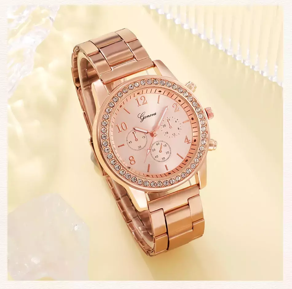 • Design incrustado de strass:O relógio, anel, colar e brincos são adornados com strass cintilantes, adicionando um toque de glamour a qualquer roupa.